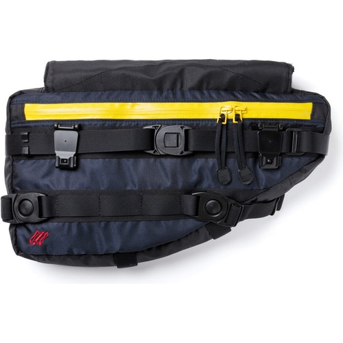 自転車のトップチューブ/ ダウンチューブ/ シートチューブに取り付け可能なフレームバッグは自転車を降りた後はボディバッグとしても使用可能な2WAY仕様。止水ジップ付きメインコンパートメント内は2つに仕切られ、荷物の細分をサポートします。