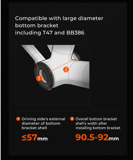 駆動側のボトムブラケットシェル外径は最大57mmまで対応可能。