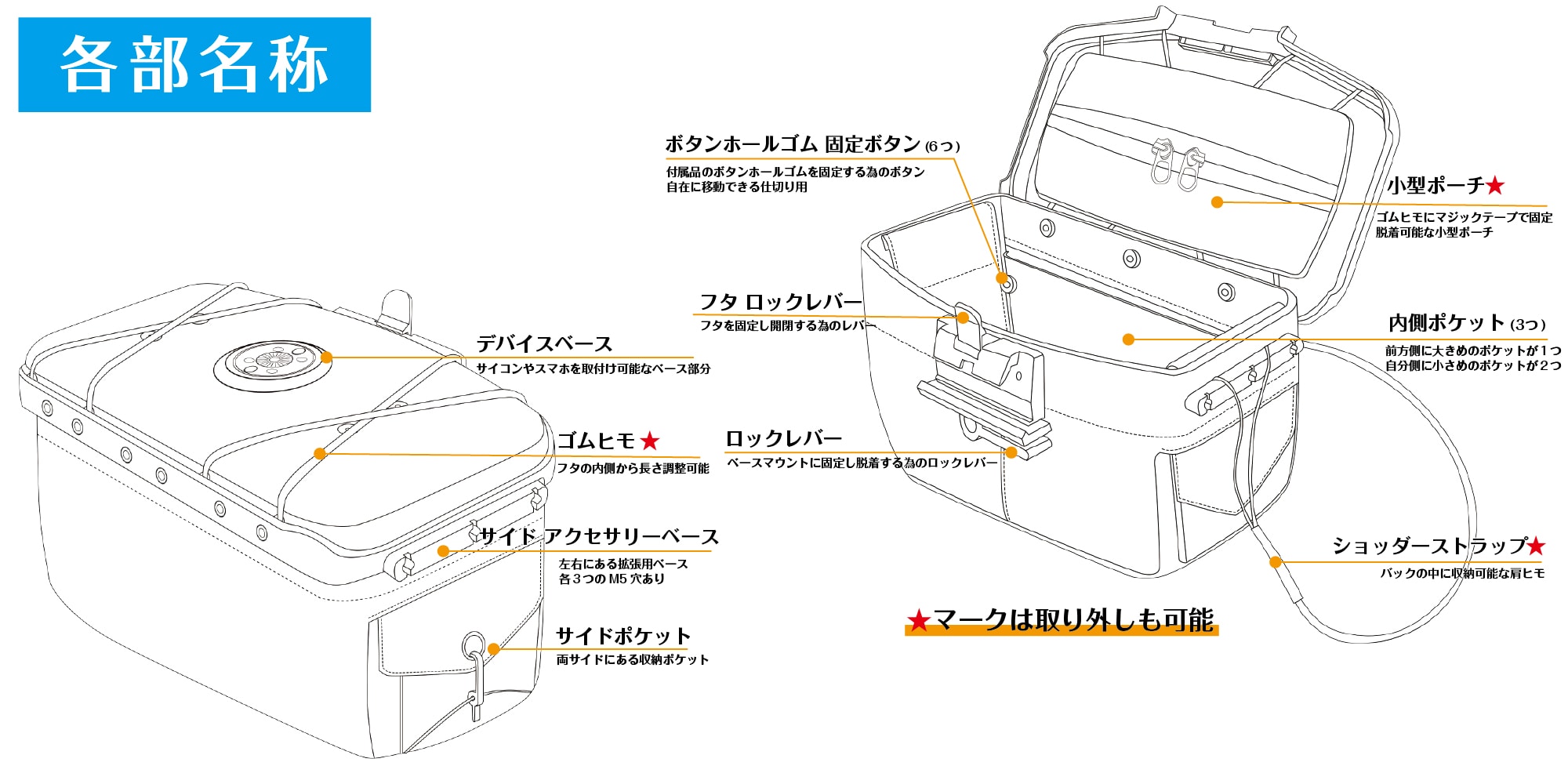 外装生地:500d PUコーティングされたCORDURA(コーデュラ) 内装生地:220d グリッドストップナイロン 上フタ:樹脂系 ヒンジ・脱着部・バッグの枠・サイドアクセサリーベースなど:アルミ製 外側は撥水性のある生地。小雨であれば浸水しませんが縫製品なので完全防水ではありません。 |