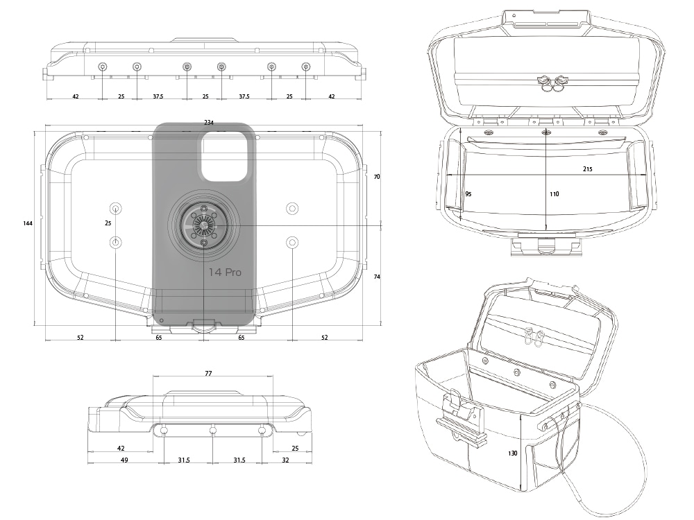 サイズ 外寸(約):奥行144mm x 幅234mm x 高さ153mm 内寸(約):奥行95mm-110mm × 幅215mm × 高さ130mm |
