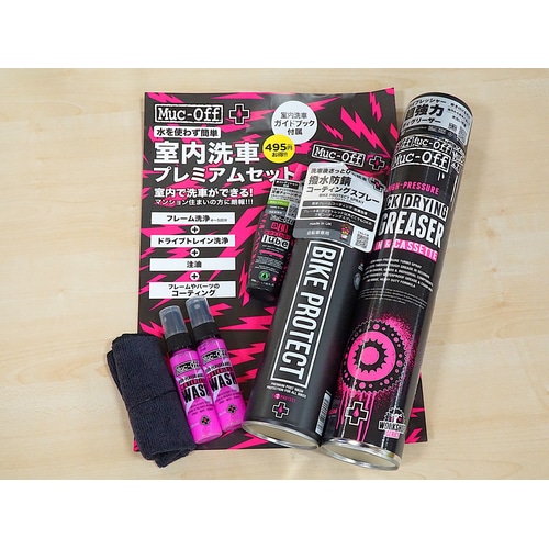 スポーツサイクルのフレームやフォークを簡単に綺麗に出来る『ウォータレスウォッシュ』と拭き上げに最適な『マイクロファイバークロス』、ドライブトレインの洗浄と注油が簡単に出来る『ハイプレッシャークイックドライングディグリーザー』と『オールウェザールブ』、さらに洗車の仕上げにとても役立つコーティングスプレー『バイクプロテクト』が加わったプレミアムセット。使い方はとても簡単で、よく振ってから吹きかけて30秒待つだけ、あとは撫でるように優しく拭くだけで浮いてきた汚れを取る事ができます。