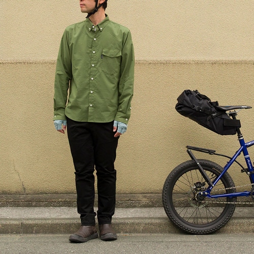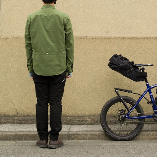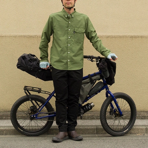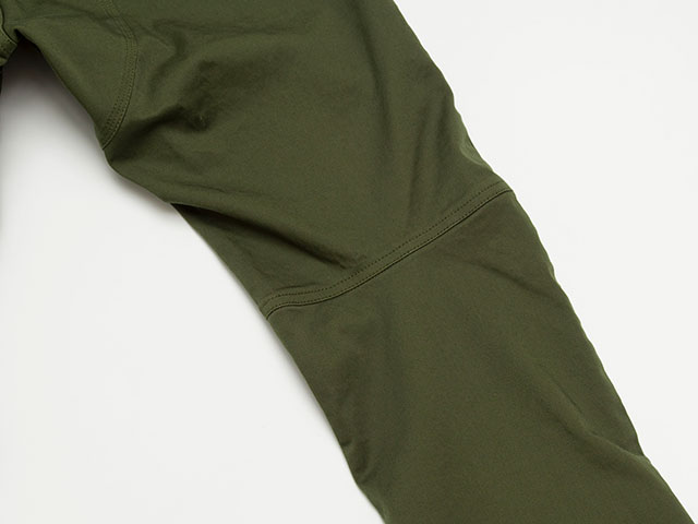 一見するとシンプルなデザインのチノパンツですが、ペダルをこぎやすい形状や、サドルとの摩擦を考えた補強、動きやすい素材などで自転車に乗りやすく作っています。足を動かしやすいためアウトドアアクティビティにも。
