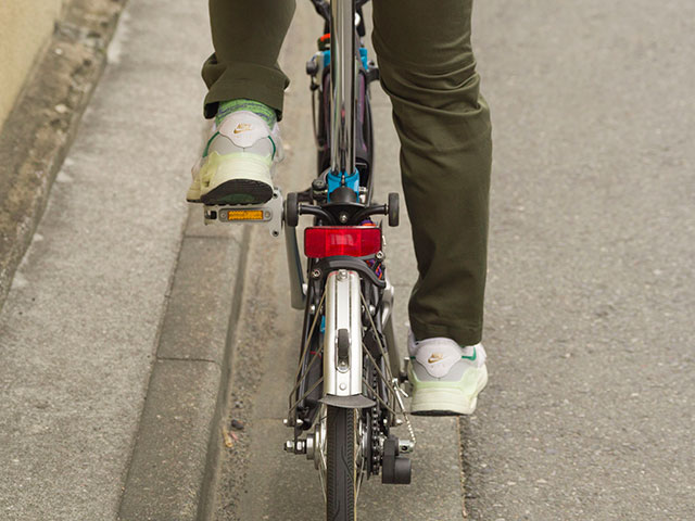 そこで、チェーンへの接触を防げるよう一般的なパンツよりも裾周りを細身にしました。(Mサイズで35cm)