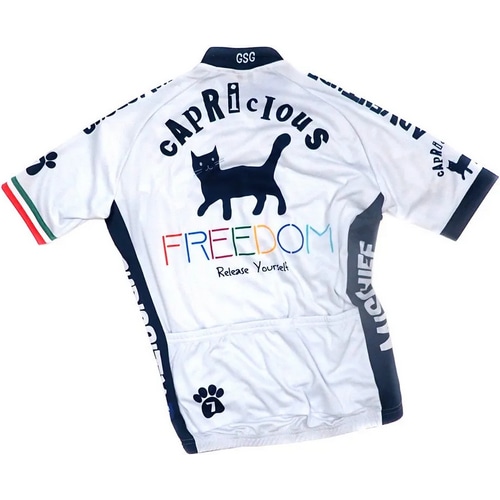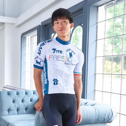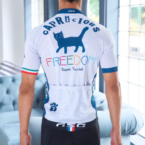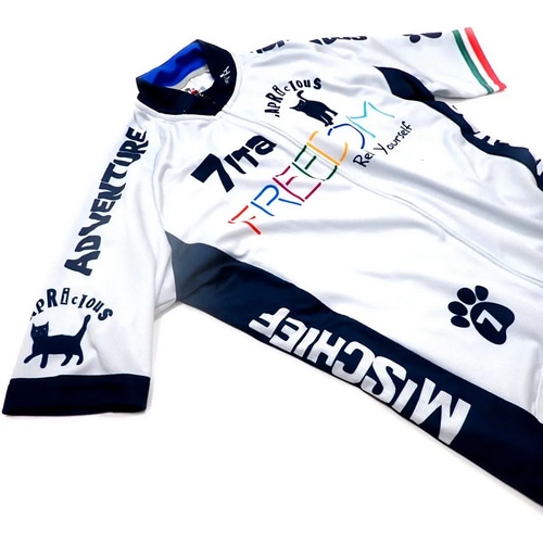 7ITAコレクションで繰り返しモチーフとされてきた7ITAを象徴する言葉「Freedom」そして自由なネコ達のサイクルジャージ。