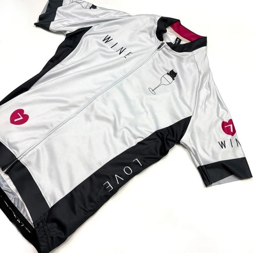 ワイングラスの後ろからネコちゃんが覗くなんともかわいいデザインのレディースサイクルジャージ。