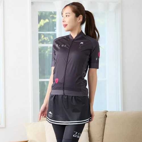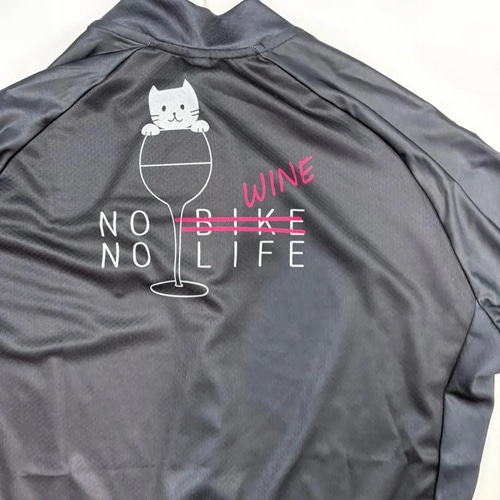 ワイングラスの後ろからネコちゃんが覗くなんともかわいいデザインのレディースサイクルジャージ。