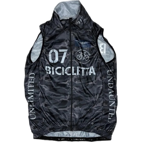 7ITAでは定番となったカモ柄のジレ(防風ベスト)Ultimate Weapon to get Freedomは「自由を得る究極の武器=自転車」というメッセージです。