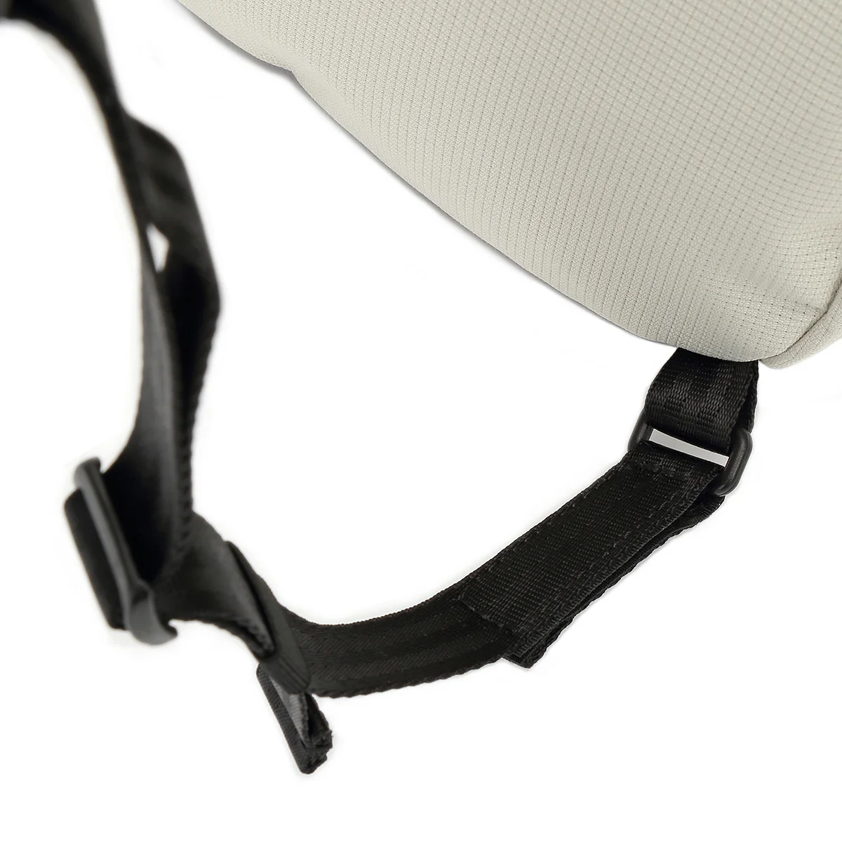 軽くてシンプル、スムーズなベルト調節が可能なクイックリリースバックルとバッグのブレを防止するサブストラップ。