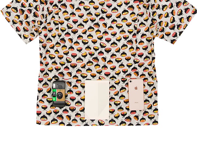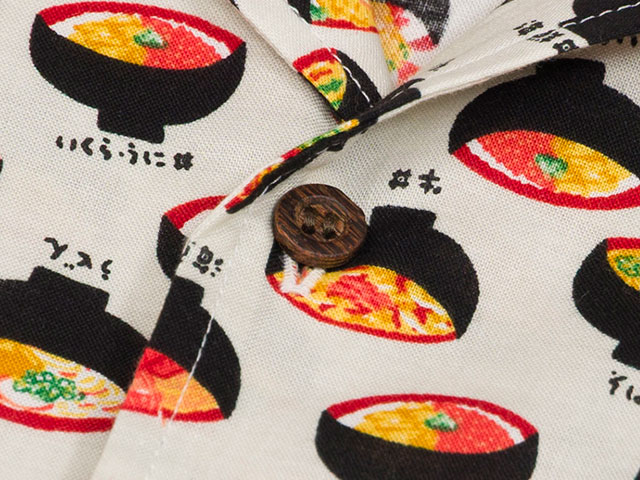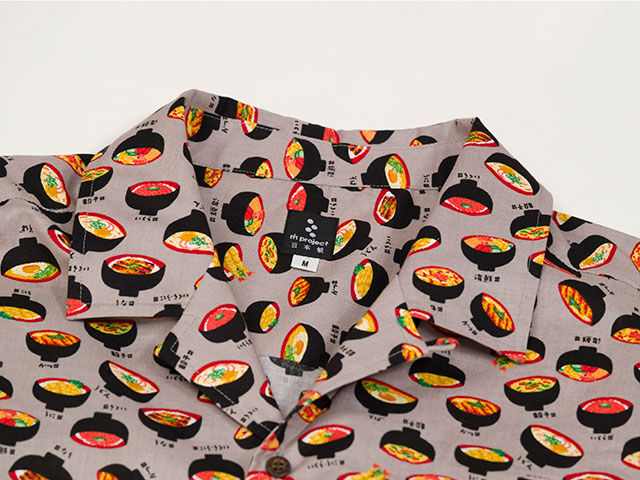 背中にポケットを付けた自転車でも便利な開襟シャツ「サイクリストアロハ」に、日本の食文化を支える丼料理をちりばめました。