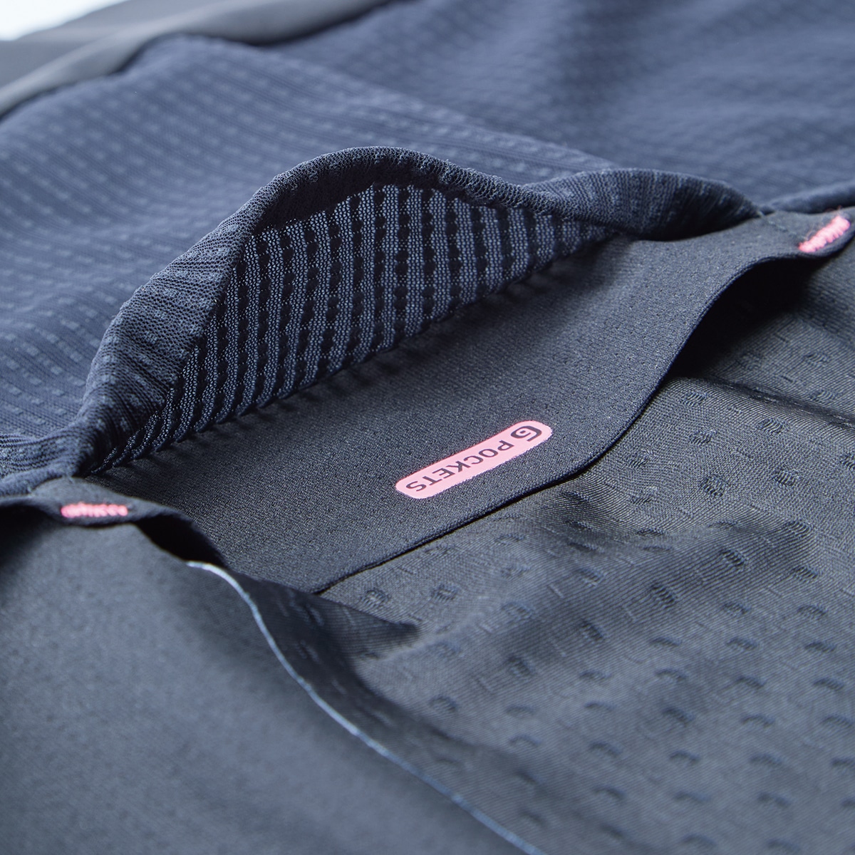 バックポケットはメッシュポケットを重ねた6ポケットで補給食の収納やゴミなどの仕分けにも便利。
