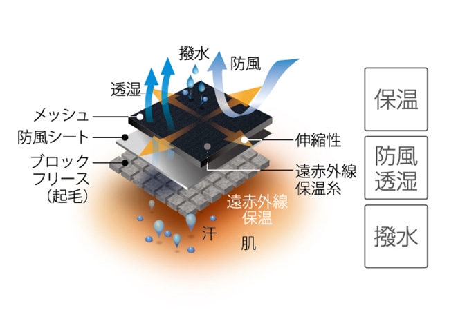 | 防風透湿 | 風の侵入を防ぎ、ムレない素材 |