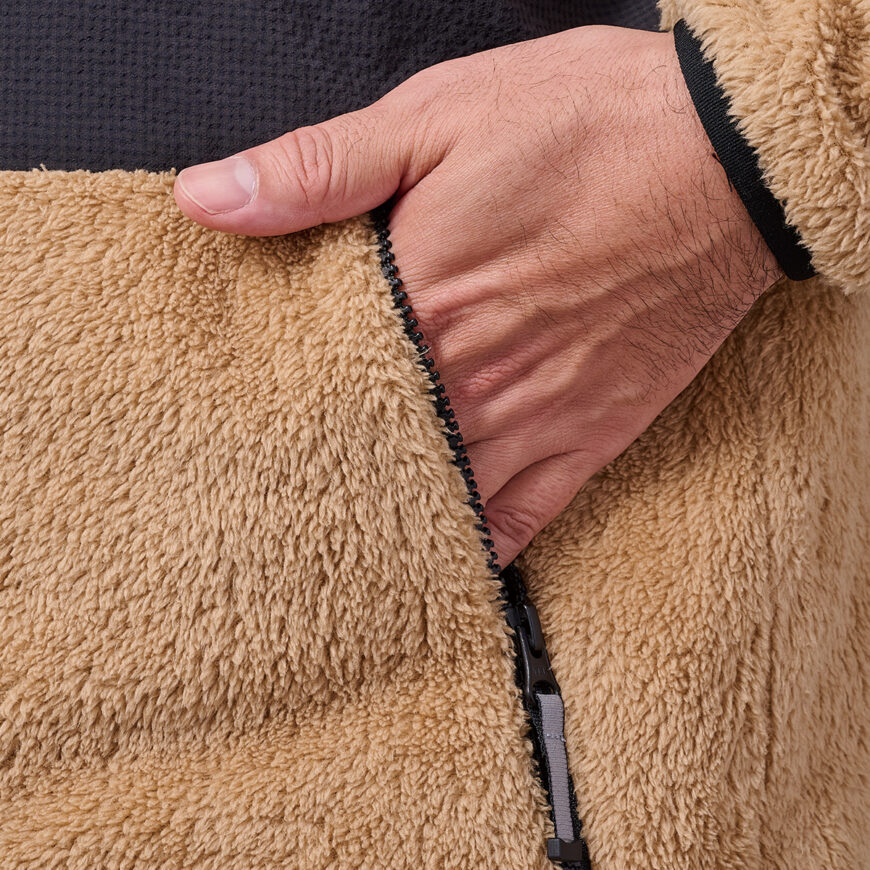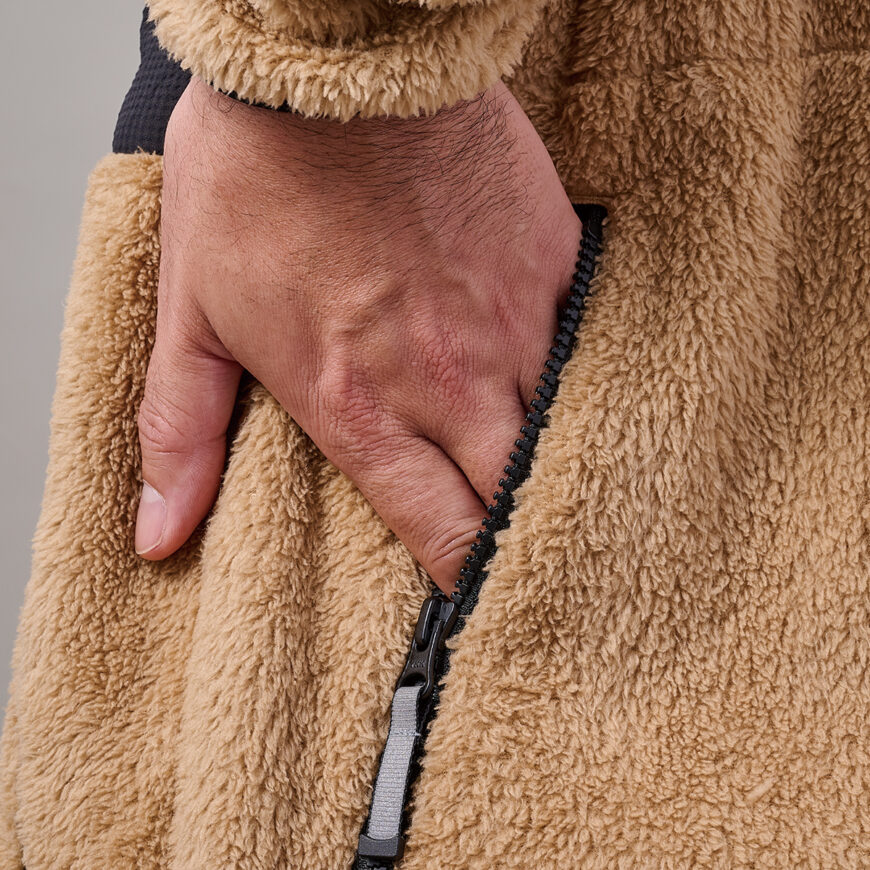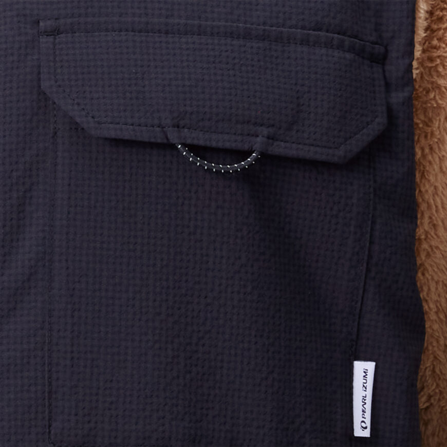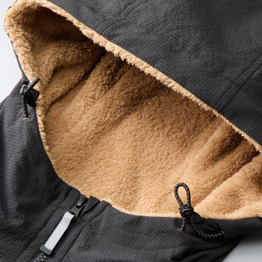 ストレッチ性と防風性の高い、凹凸感のあるカジュアルテイストのタフタ素材を組み合わせ、サイクリングに必要な機能も備えたフード付きフリースジャケット。前身頃はボリューム感のあるフリースの裏地に防風素材を配置し、冷気をシャットアウト。