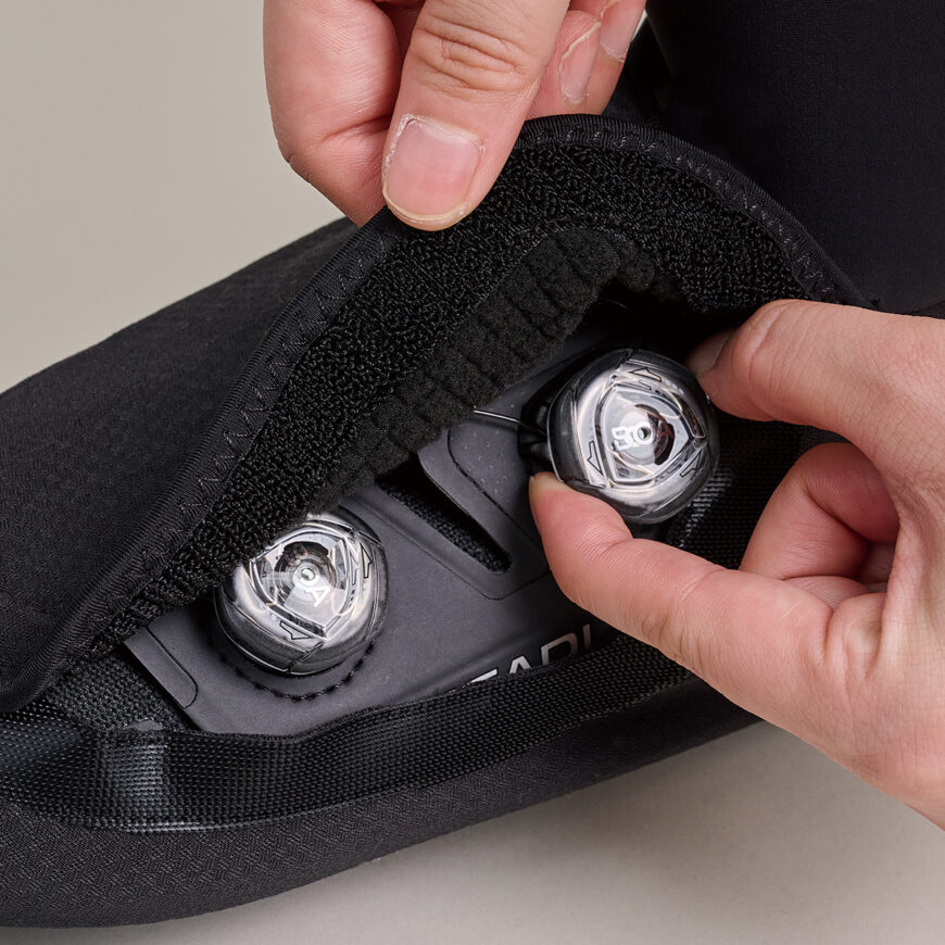 着用したままシューズのダイヤルを調整できる仕様も便利。
