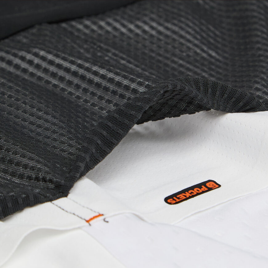 背中中心の素材は酷暑対策を考慮した通気性のよいメッシュ素材。