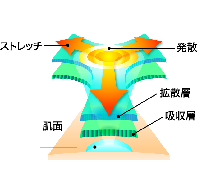多層構造体により、高い吸水性と拡散性を実現。かいた汗の濡れ戻りや含水により、カラダが冷える不快感やベタつきのない機能を持つ2ウェイ?ストレッチ素材です。