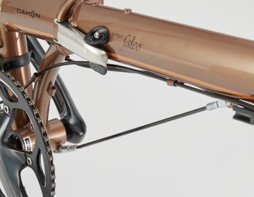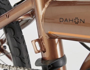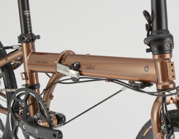 ラディアスハンドルポストはDAHONが誇るフュージョンテクノロジーにより、フォークからフレーム、ステムへと滑らかにつながるデザインを可能にしました。また、折り畳み構造の中心となるカップリングシステムは、強固な固定強度が得られる「InSide」ロッキングメカニズムを採用することで、折り畳みステムとしては考えられる最高の性能を有しています。