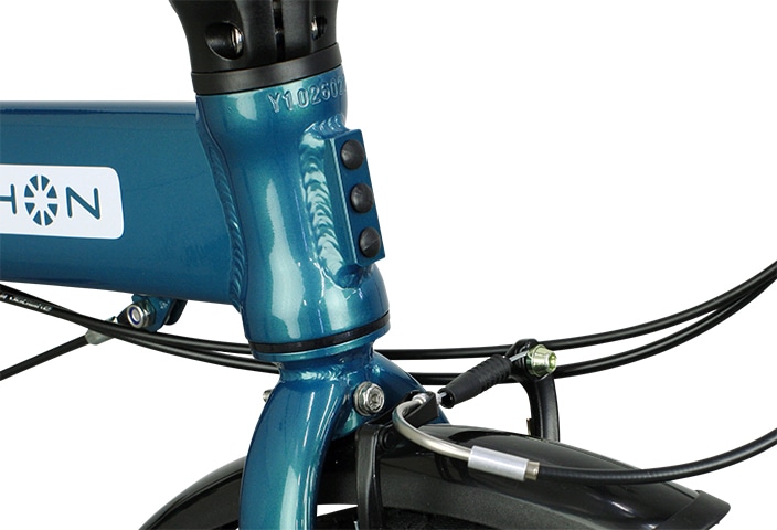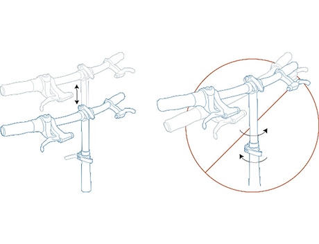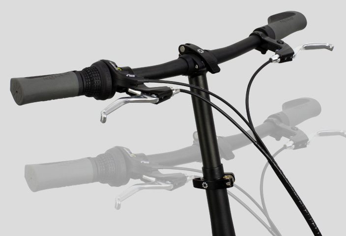 ハンドルポストの中央部に設けられたクイックレバーによりハンドルポジションを上下に変更できる可動式ハンドルポスト。ステム内部の溝がハンドルの左右への回転を防ぎ、折り畳み自転車に求められる安全性と操作性を両立させています。