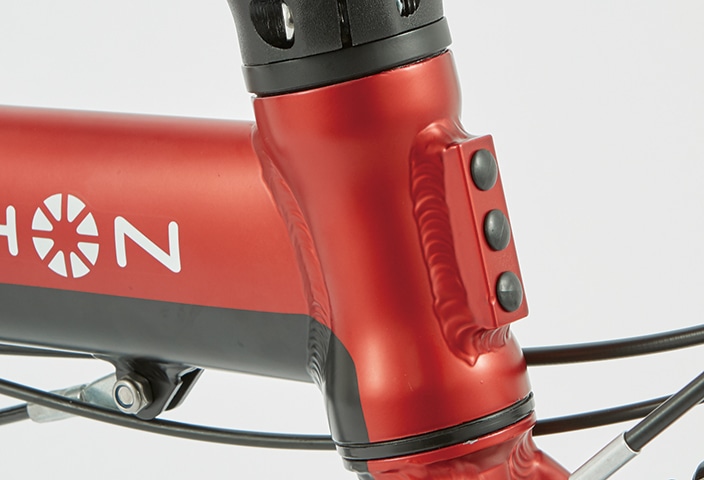 ラディアスハンドルポストはDAHONが誇るフュージョンテクノロジーにより、フォークからフレーム、ステムへと滑らかにつながるデザインを可能にしました。また、折り畳み構造の中心となるカップリングシステムは、強固な固定強度が得られる「InSide」ロッキングメカニズムを採用することで、折り畳みステムとしては考えられる最高の性能を有しています。