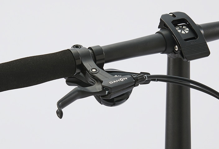 ラディアスハンドルポストはDAHONが誇るフュージョンテクノロジーにより、フォークからフレーム、ステムへと滑らかにつながるデザインを可能にしました。また、折り畳み構造の中心となるカップリングシステムは、強固な固定強度が得られる「InSide™」ロッキングメカニズムを採用することで、折り畳みステムとしては考えられる最高の性能を有しています。