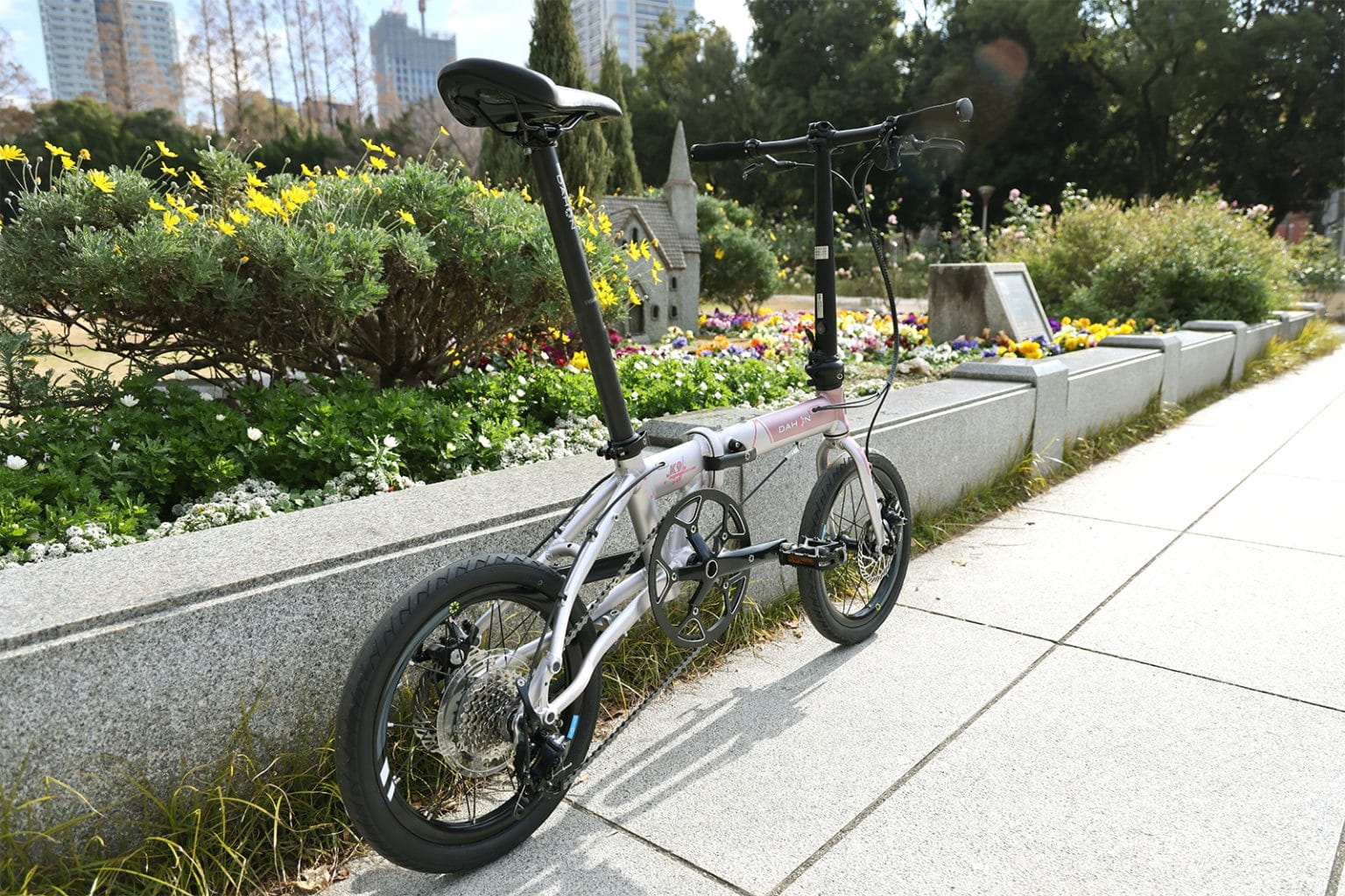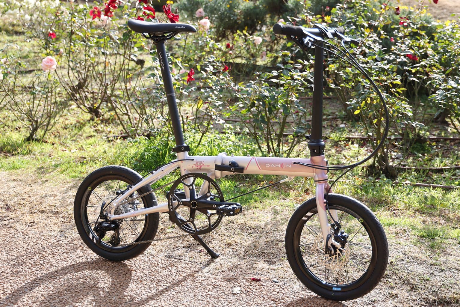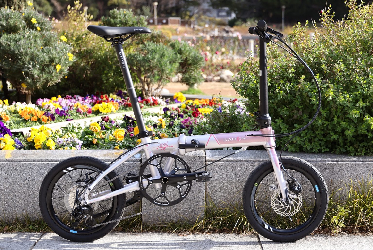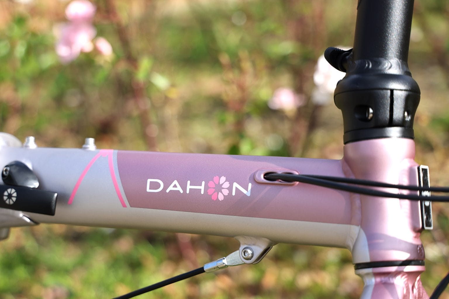 DAHONが生まれたカリフォルニアでも、春になると桜が咲き、やわらかな光の中で街の景色がふっと色づきます。日本の春の象徴でもある桜。そのひとときの美しさを写し取った桜色が、ブラックで統一されたパーツに映え、高級感のある特別な1台となりました。