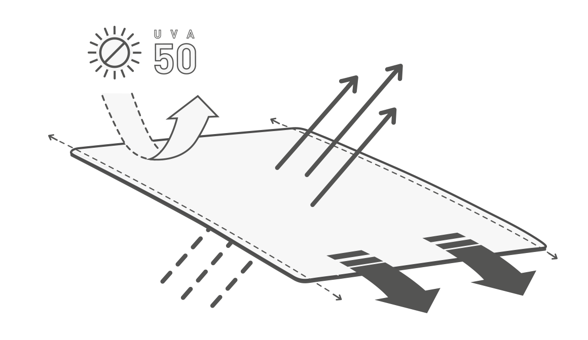 高い通気性と圧縮性を実現するために開発されたテクニカルファブリック。軽量繊維で構成され、50+の紫外線防止効果(UVA)を提供します。