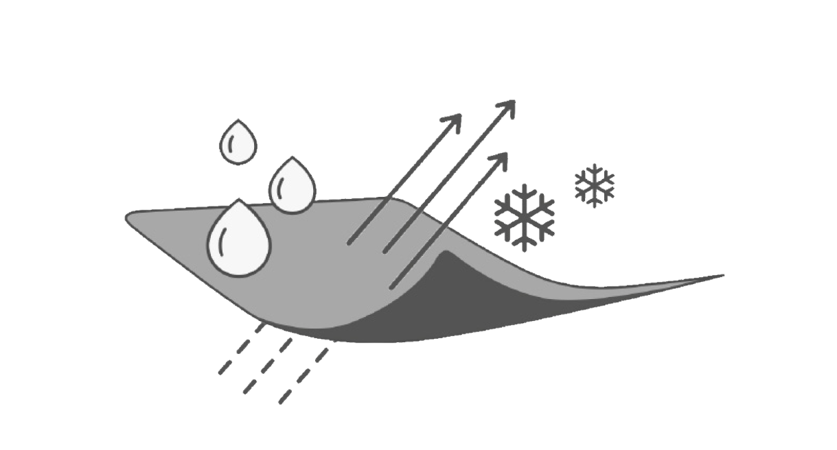 軽量なトリプルメンブレンは、雨や風に対する効果的なバリアとして機能し、水をはじきながら、運動によって発生する湿気を効率的に排出します。