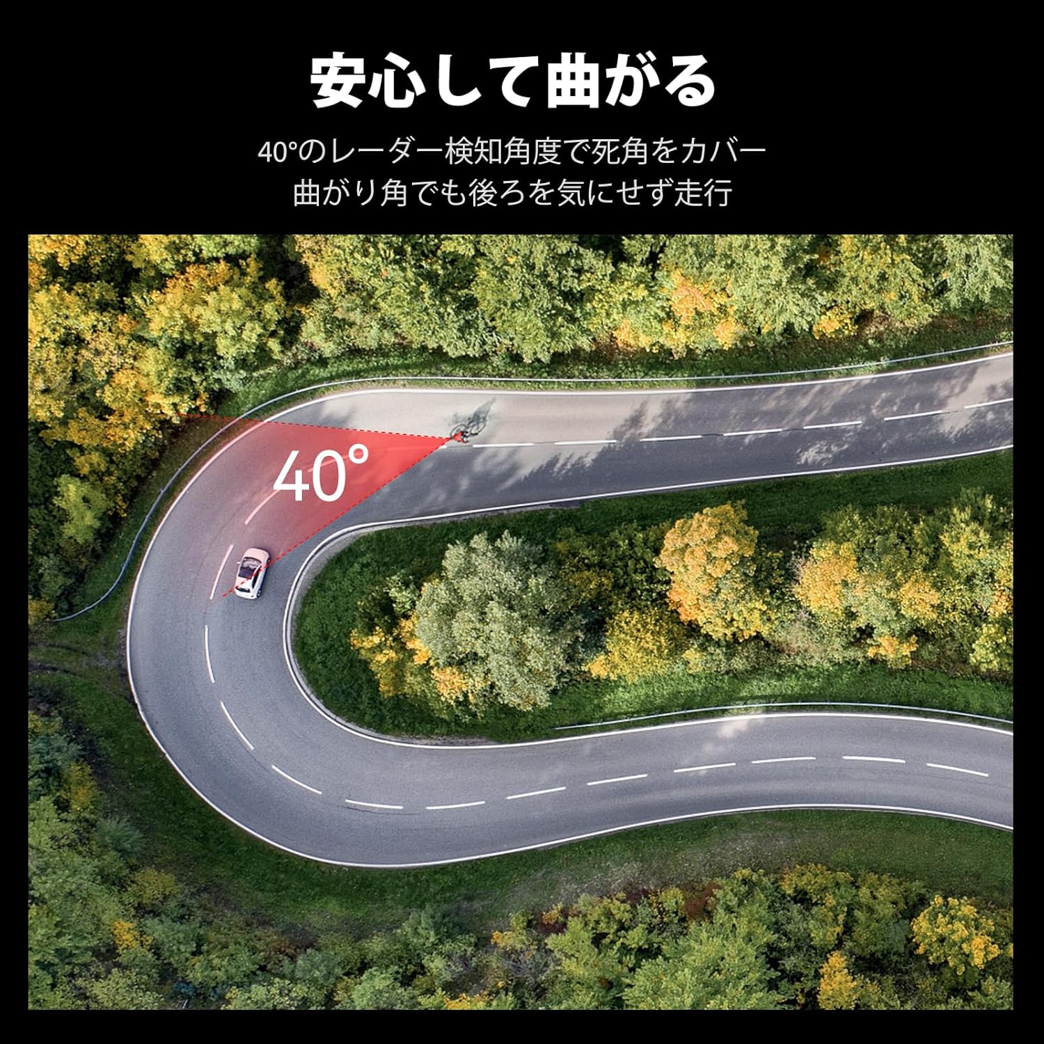 最大270°の視認性を実現し、死角やカーブでも後方の車両を40°の範囲で検知可能。交差点や見通しの悪い場所でも早期警告で安心して走行できます。