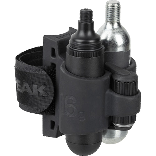 Nano AirBooster CO2インフレーター、TubiCartridge R16、16g CO2カートリッジをセットにし、ロードバイクのチューブレスタイヤ修理と空気充填に対応。付属のマウントモジュールとグリップストラップにより、安全かつ確実に固定可能。