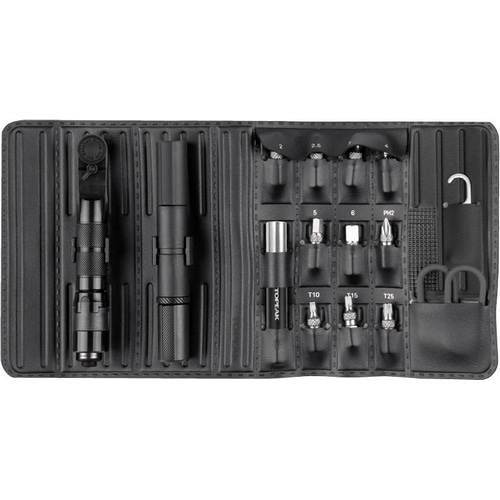 セット内容には、スピードスリーブビットホルダー、2 / 2.5 / 3 / 4 / 5 / 6mm六角レンチ、T10 / T15 / T25 Torx®(トルクス)ビット、#2 +ドライバービット、アルミニウム製CO2インフレーター、ステンレス製3.5mmプラグ挿入ツール、タイヤ修理プラグ、チェーンツール、チェーンフックが含まれます。
