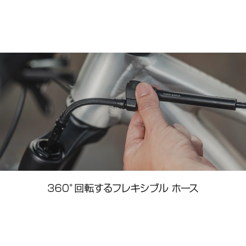 | その他仕様 | ・米式専用口金 ・プレッシャーライト口金 ・最大300psiまで充填可能 ・1ストロークの空気量 : 4.7cc ・アルミ合金 シリンダー ・360°回転するホース |