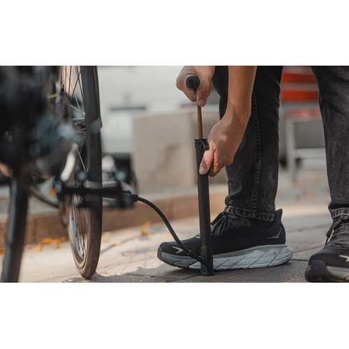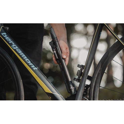 フロアポンプと同じようにハンドルに体重をかけられ、女性でも確実に高圧が入れられるポータブルポンプ。