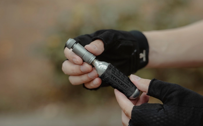 仏式・米式バルブに対応し、ネジ付きカートリッジを装着して使用します。サドルバッグやツールケース内でも邪魔にならず、レースやロングライドでの携帯性を最優先したモデルです。