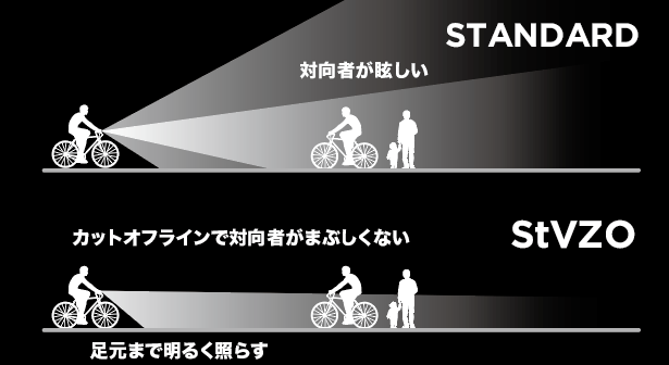 市街地走行など交通量が多い場所でおすすめなStVZOですが、バッテリー容量でも違いがあります。同じルーメン数のライトとランタイム(点灯時間)の比較をしたとき、通常のライトよりも1.3?2.8倍ランタイムが長く、