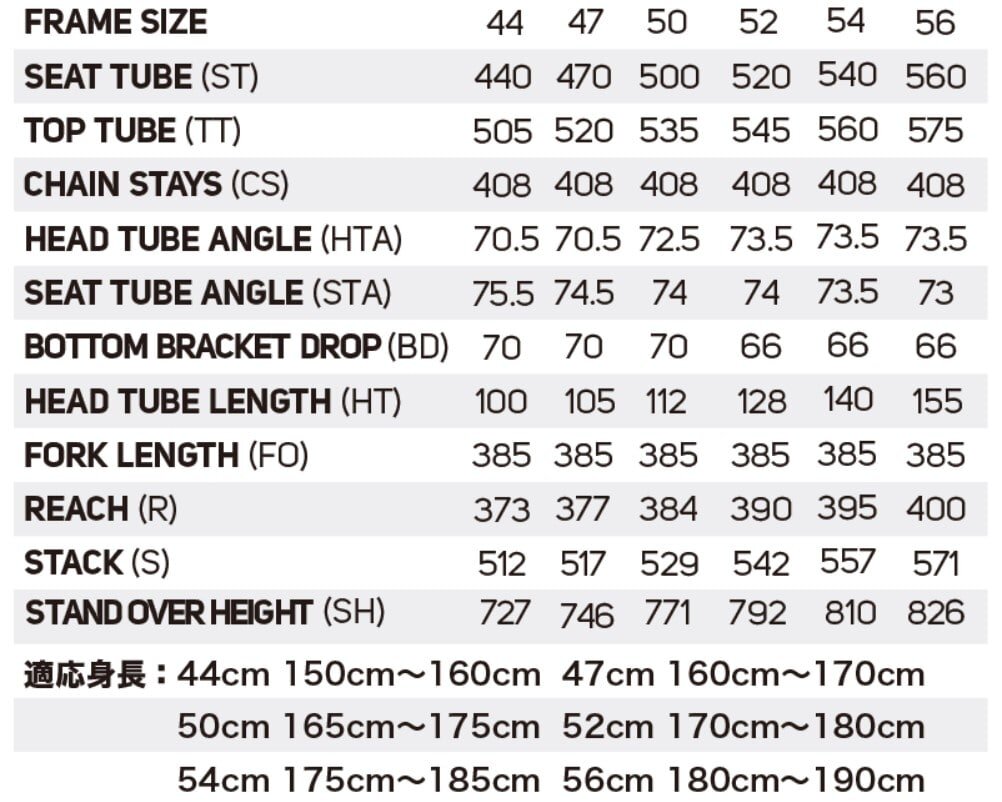 | ギヤクランク | Shimano Ultegra 52-36T L:165mm(3XS/XXS) L:170mm(XS) L:172.5mm(S/M) |