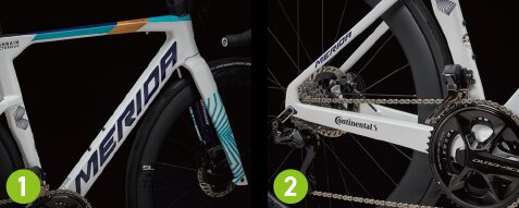 MERIDAの特別な「NACA FASTBACK」チューブ形状は、風洞実験での数値に基づいて最適化されたプロファイル。ダウンチューブ、シートチューブ、シートステーの後端部がカットされた断面を持つ特徴的な形状は空力性能と剛性を両立。
