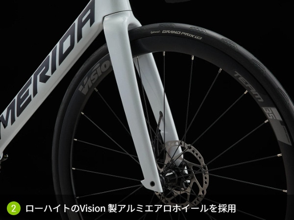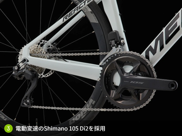 バーレーン・ヴィクトリアス仕様と同じジオメトリーを採用するREACTO CF3 フレームに、リヤ12速のShimano 105 Di2を組み合 わせたハイコストパフォーマンスモデル。ケーブルをセミインテグレート出来るMERIDA EXPERTステムは空力性能とメンテナンス 性を両立。エアロフレーム&ディスクブレーキ、電動変速機のすべてを併せ持つエアロレーシングバイク。
