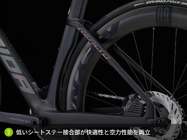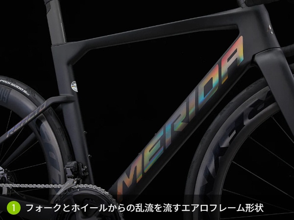 MERIDAの特別な「NACA FASTBACK」チューブ形状は、風洞実験での数値に基づいて最適化されたプロファイル。ダウンチューブ、シートチューブ、シートステーの後端部がカットされた断面を持つ特徴的な形状は空力性能と剛性を両立。
