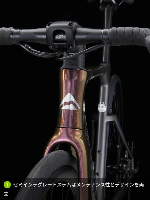 MERIDA独自の設計のヘッドセットを通じてケーブル内装ルーティングを実現。クリーンで洗練された見た目を、フレーム構造への影響なしに達成。モデルによりハンドルバーとステムを含む完全インテグレーテッドルーティングを実現しているものと、ステム下から内装されるセミインテグレーテッドルーティングがある。