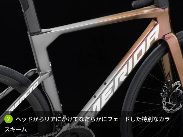 グローバルモデルの上位バイクで採用されているレインボーのフェードカラーを日本市場のために採用した特別なリアクト。チーム仕様と同じジオメトリーを持つREACTO CF3 カーボンフレームに、リヤ12速となった機械式のShimano 105を搭載。自社で設計から製造までを行うマニファクチャーブランドならではのオリジナルスペック。