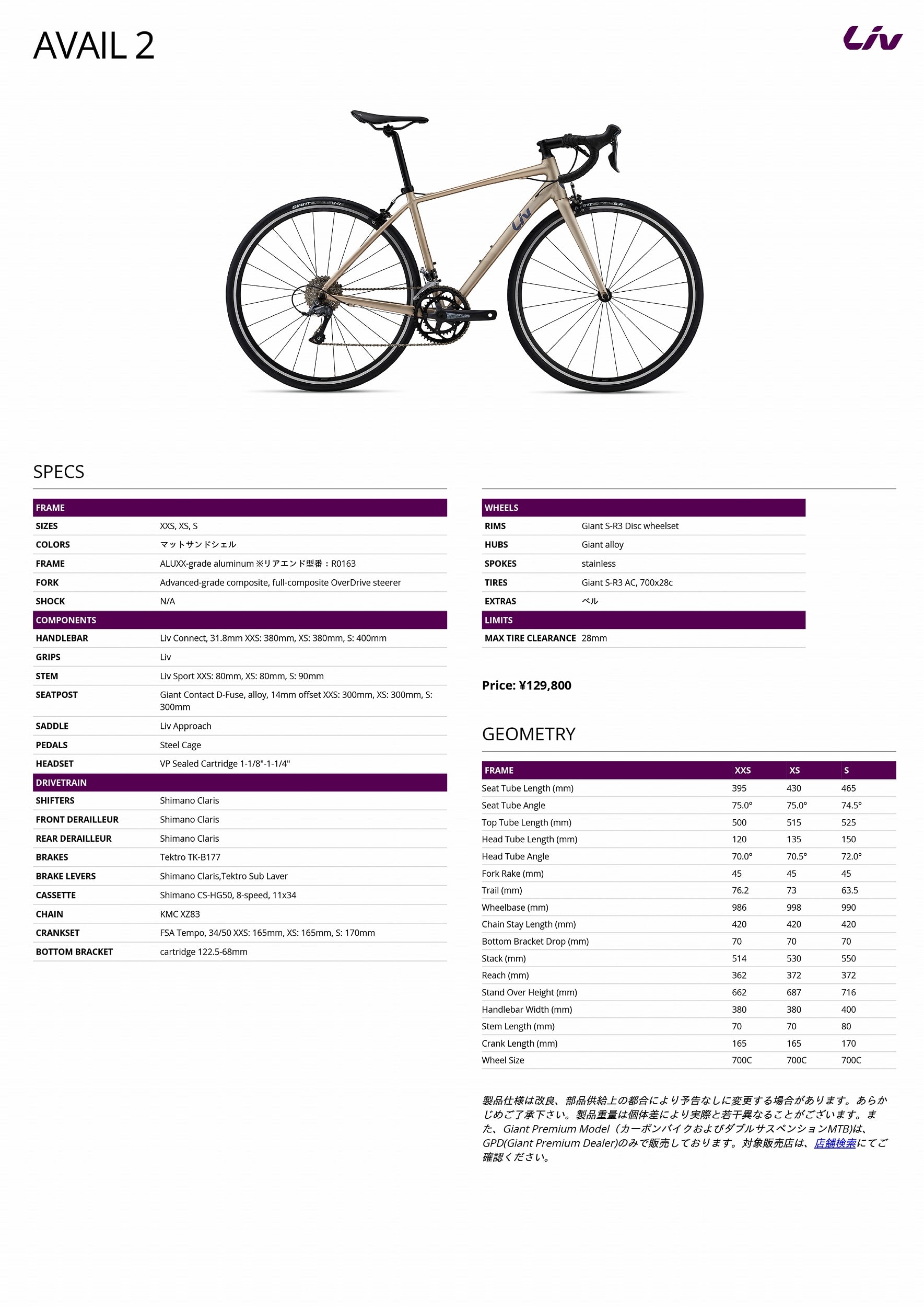 最新の仕様については公式サイト GIANT / Liv の情報をご確認ください