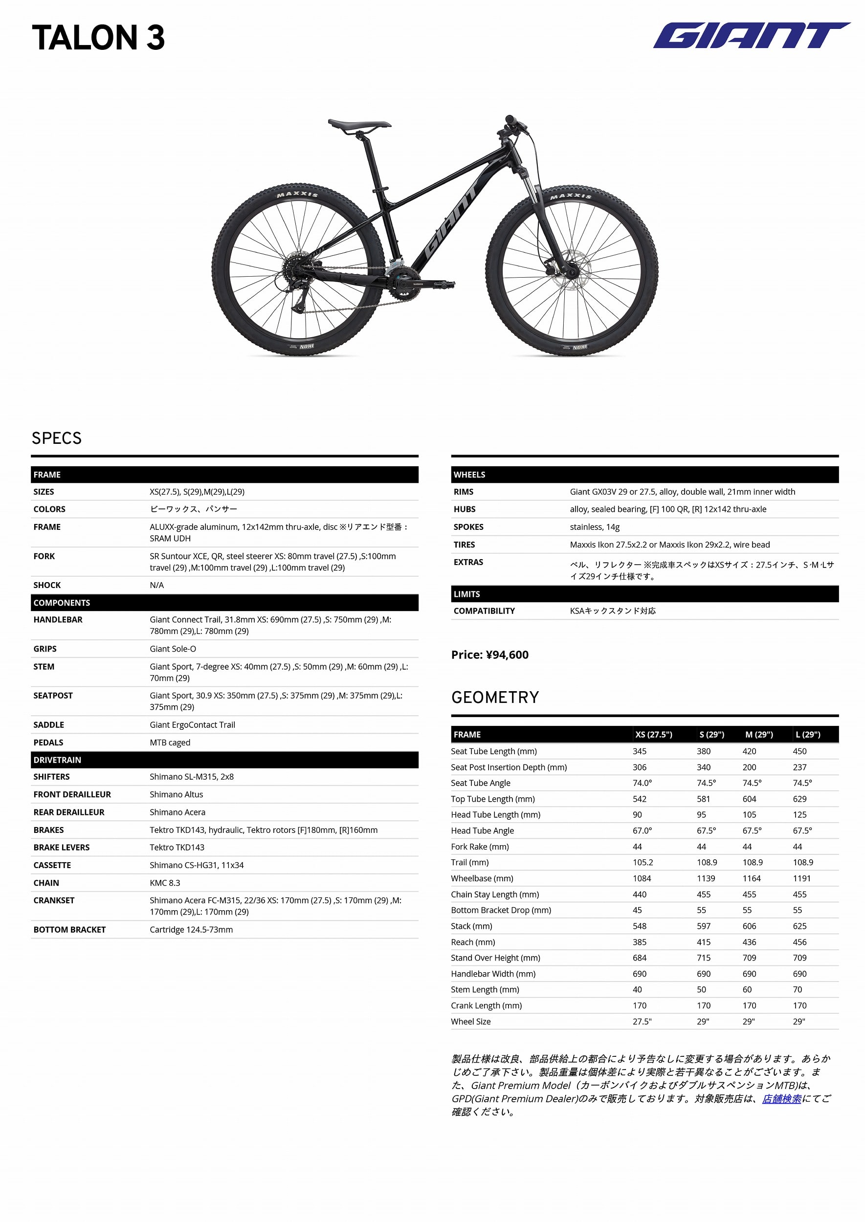 GIANT ( ジャイアント ) マウンテンバイク TALON 3 ( タロン 3 ) パンサー 350XS (身長目安160cm前後)