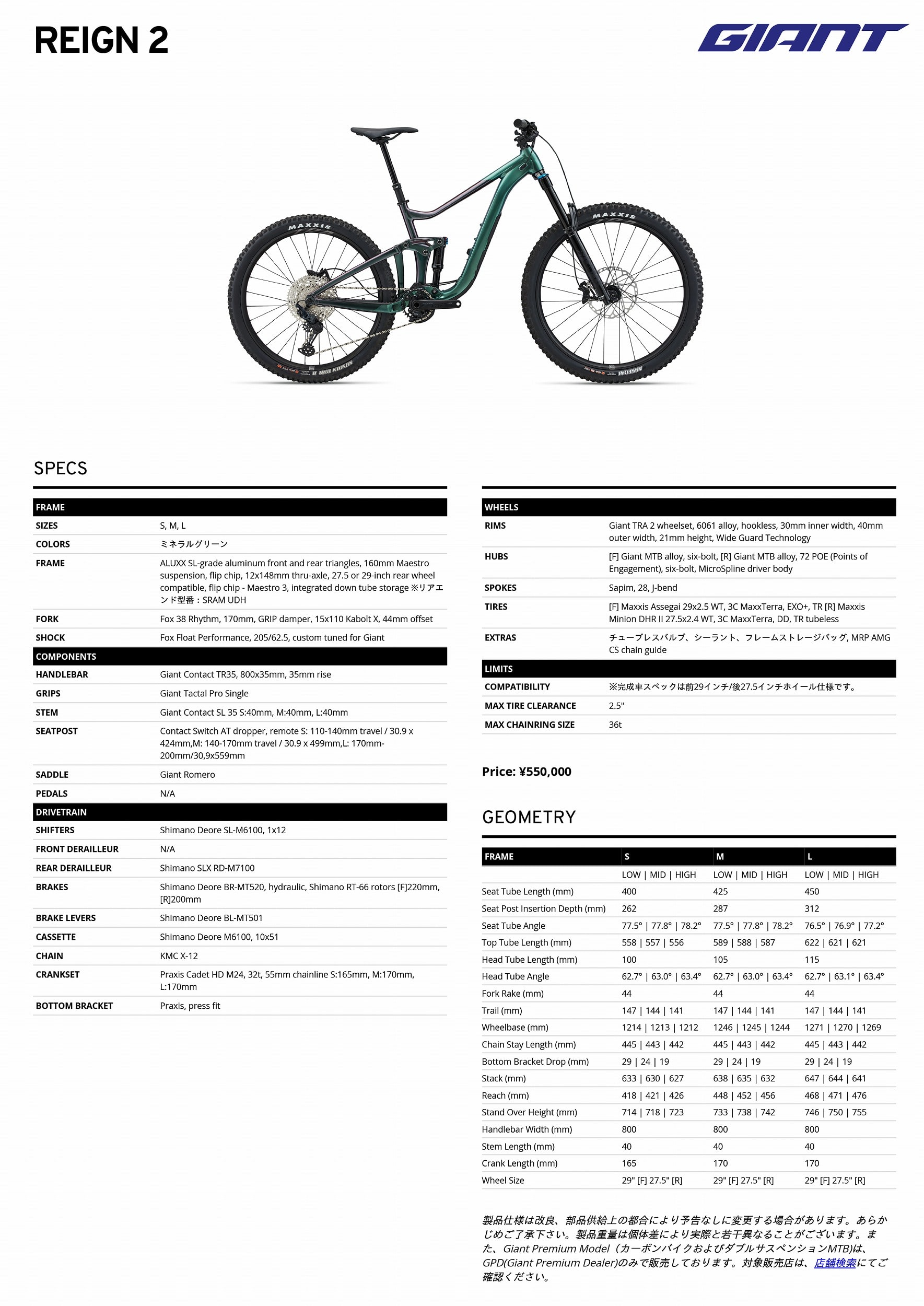 GIANT ( ジャイアント ) マウンテンバイク REIGN 2 ( レイン 2 ) ミネラルグリーン 400S (身長目安165cm前後)