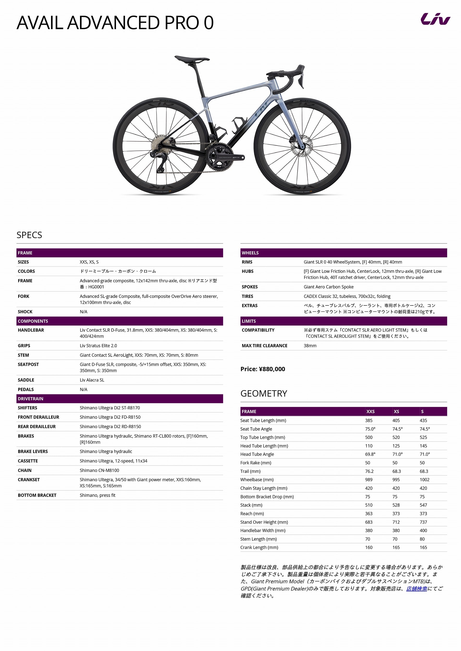 最新の仕様については公式サイト GIANT / Liv の情報をご確認ください