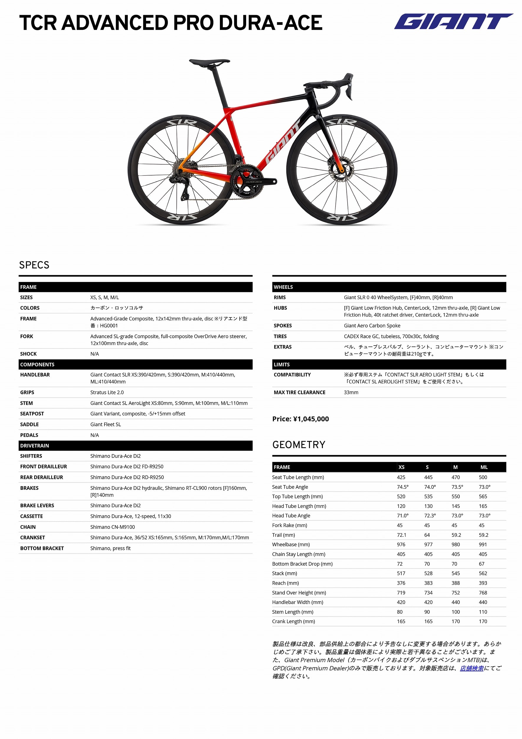 GIANT ( ジャイアント ) ロードバイク TCR ADVANCED PRO DURA-ACE ( TCR アドヴァンスド プロ デュラエース ) カーボン/ロッソコルサ 425XS (身長目安165cm前後)