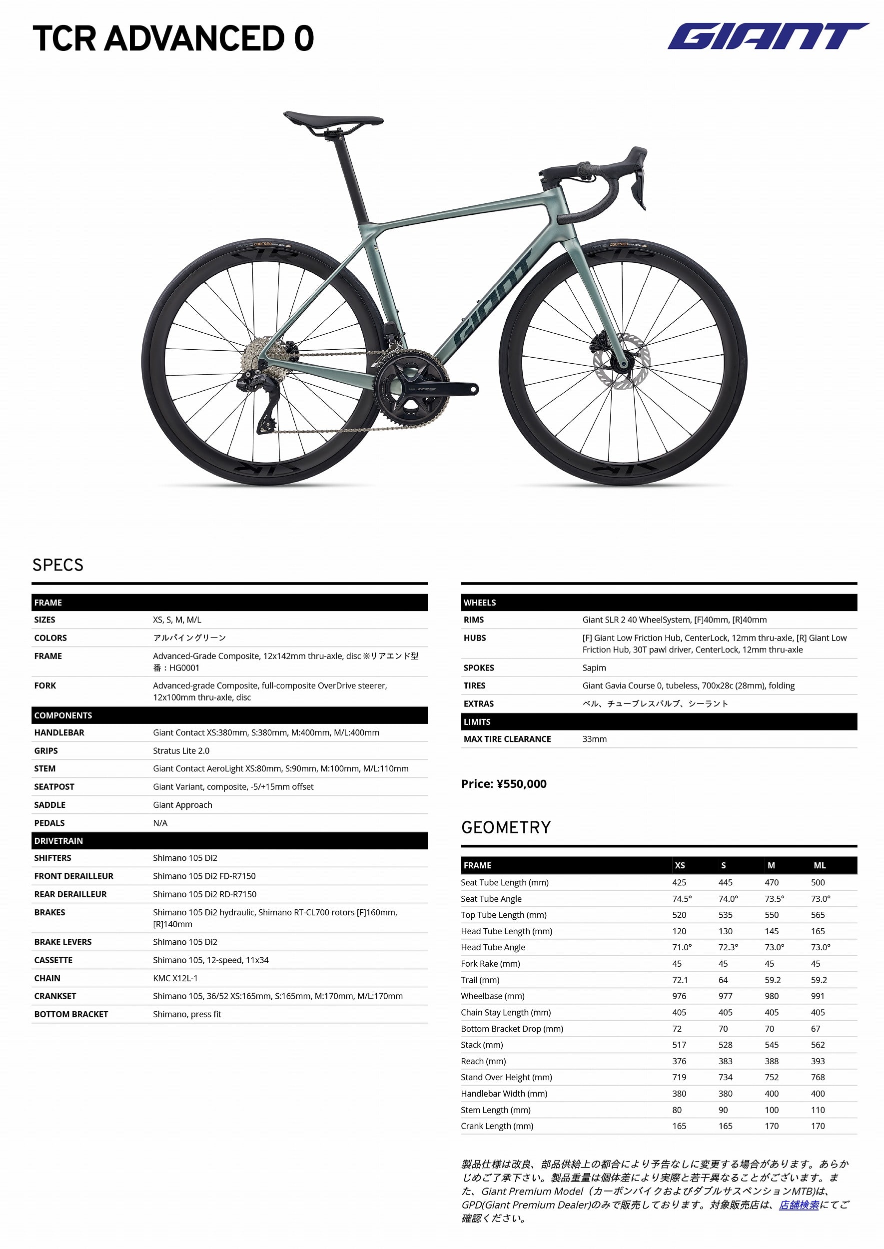 GIANT ( ジャイアント ) ロードバイク TCR ADVANCED 0 ( TCR アドヴァンスド 0 ) アルパイングリーン 445S (身長目安170cm前後)