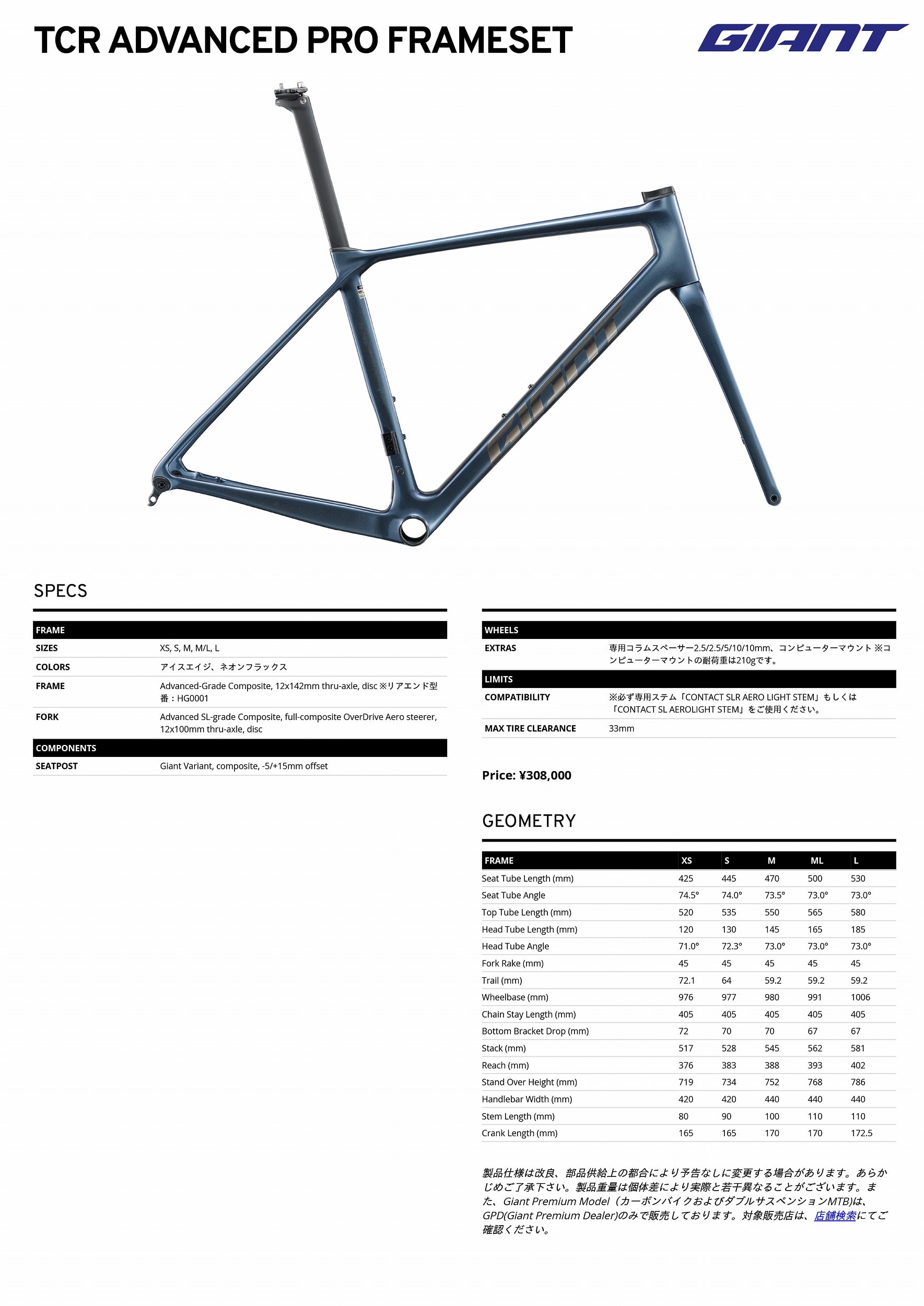GIANT ( ジャイアント ) ロードフレーム TCR ADVANCED PRO F/S ( TCR アドヴァンスド プロ フレームセット ) アイスエイジ 470M (身長目安175cm前後)