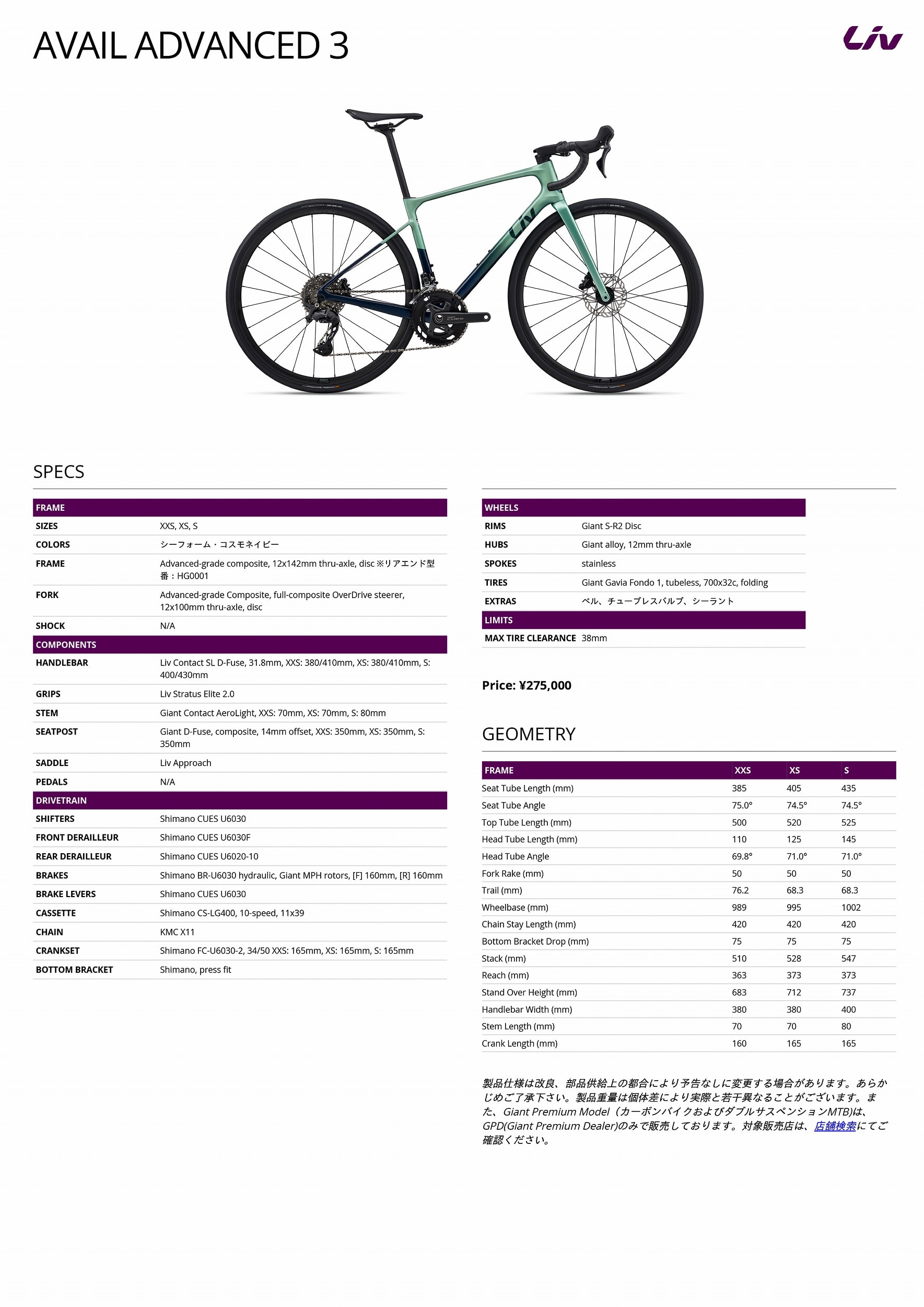 最新の仕様については公式サイト GIANT / Liv の情報をご確認ください