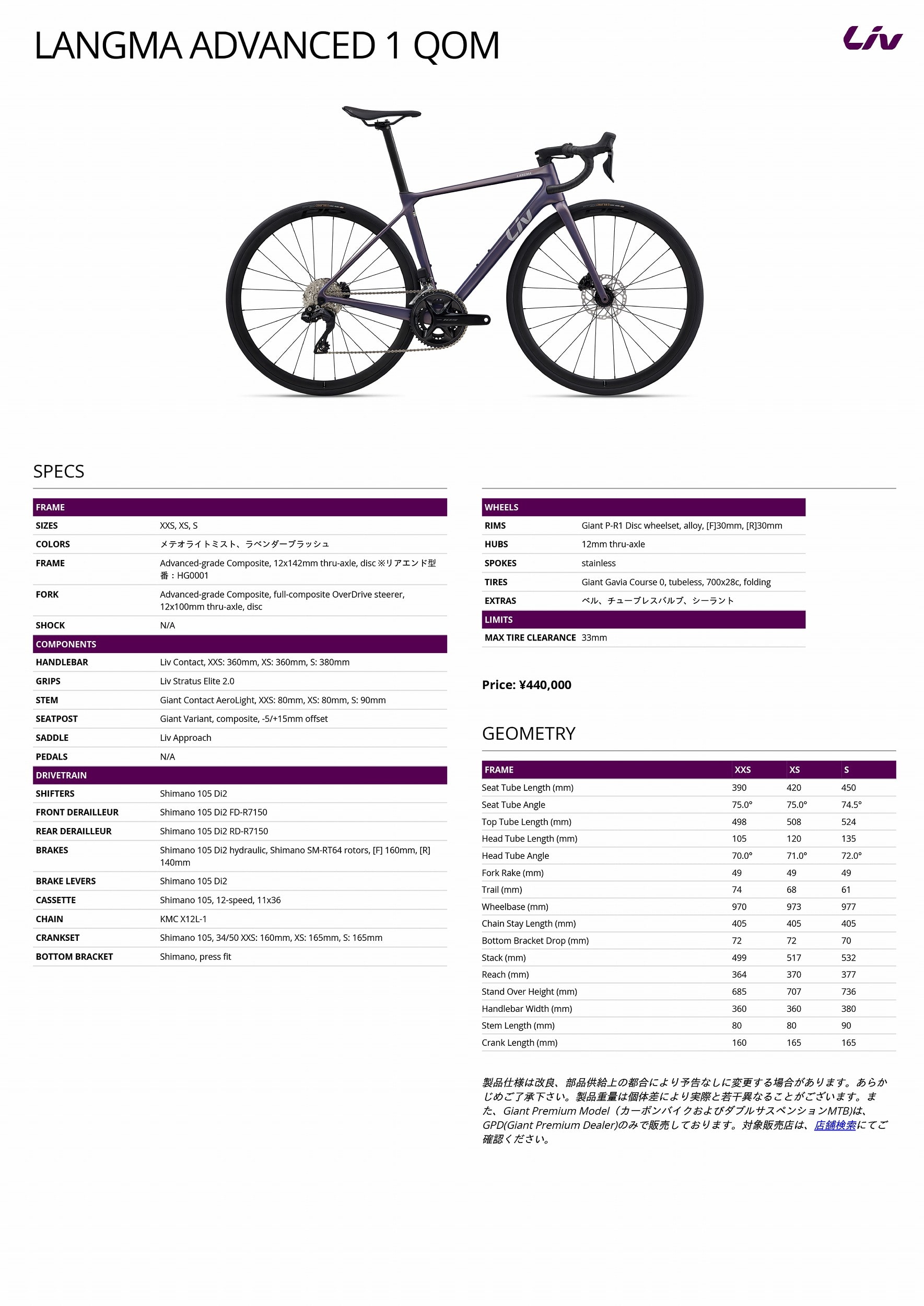 GIANT ( ジャイアント ) ロードバイク LIV LANGMA ADVANCED 1 QOM ( リブ ランマ アドヴァンスド 1 QOM ) ラベンダーブラッシュ 390XXS (身長目安155cm前後)