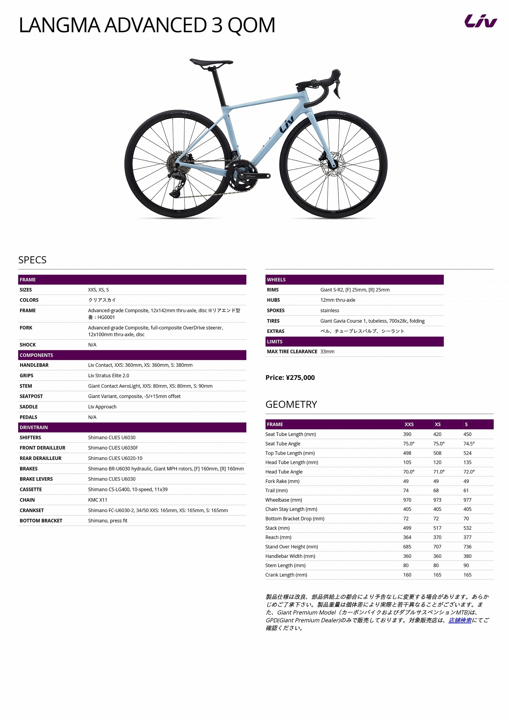 最新の仕様については公式サイト GIANT / Liv の情報をご確認ください