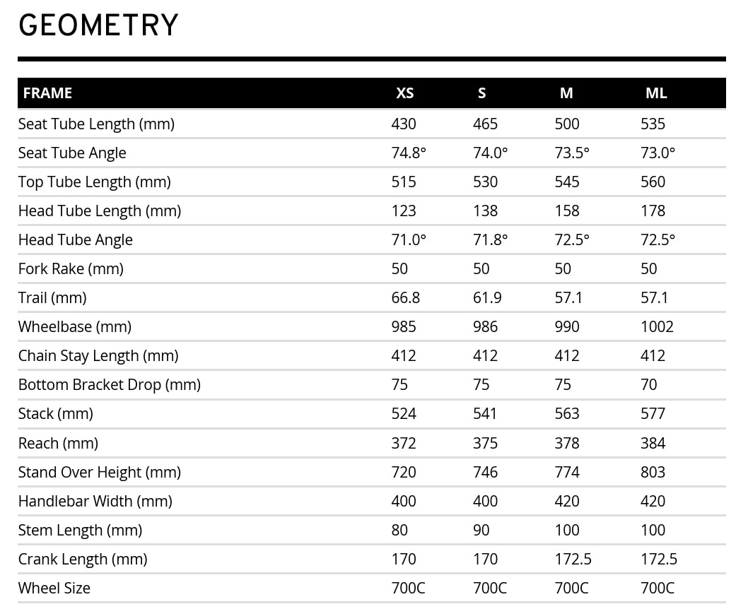| Crankset | FSA Tempo, 34/50 XS:170mm, S:170mm, M:172.5mm, M/L:172.5mm |